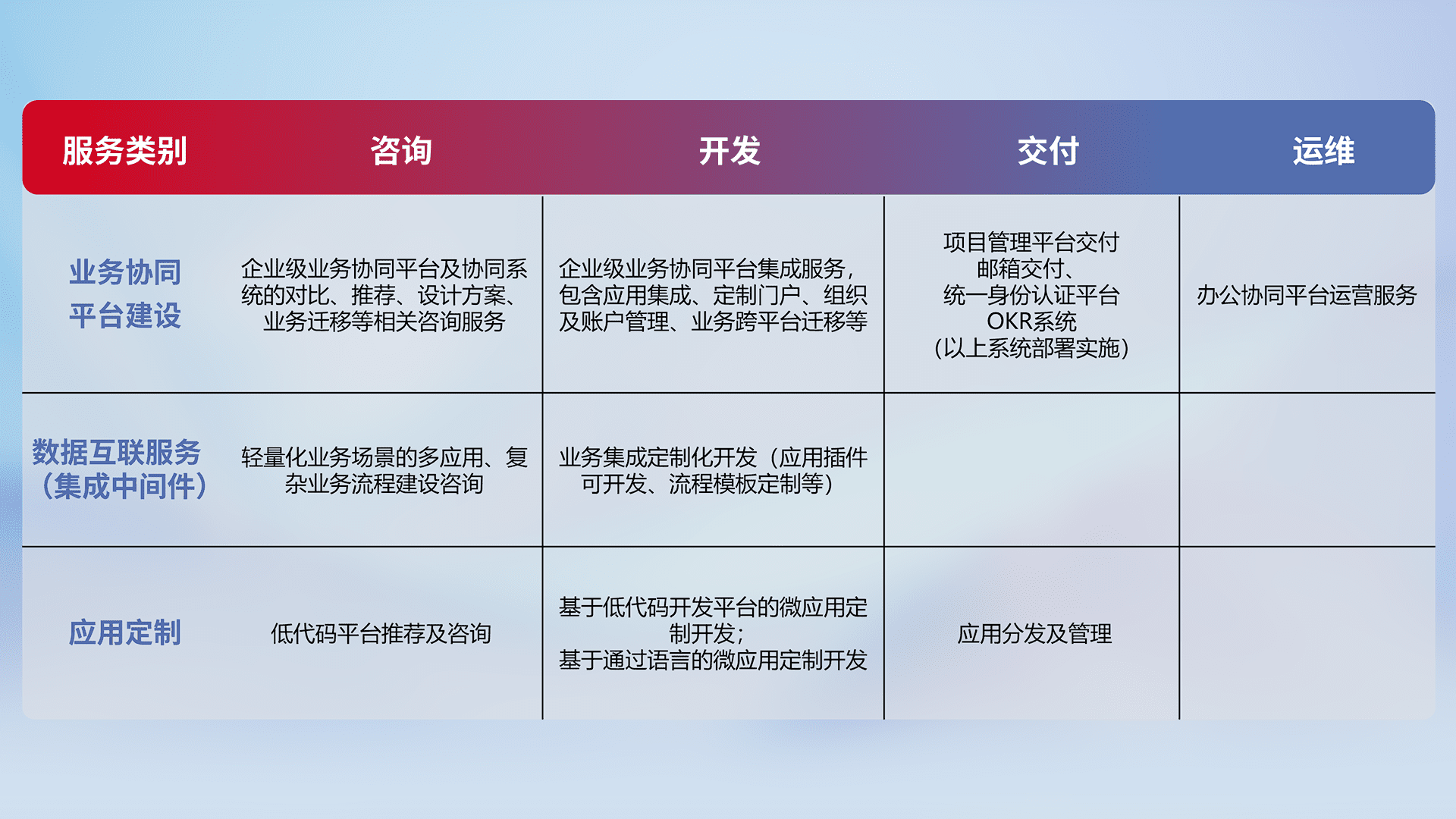 针对钉钉、、、、企微、、、、IDaas等平台级产品提供产品的规划、、、方案、、交付、、定制化开发等服务,,,实现如统一协同办公、、、、智能客户服务、、、混合会议管理、、、、智能数据查询、、、、等业务场景,,实现数字化转型。。。