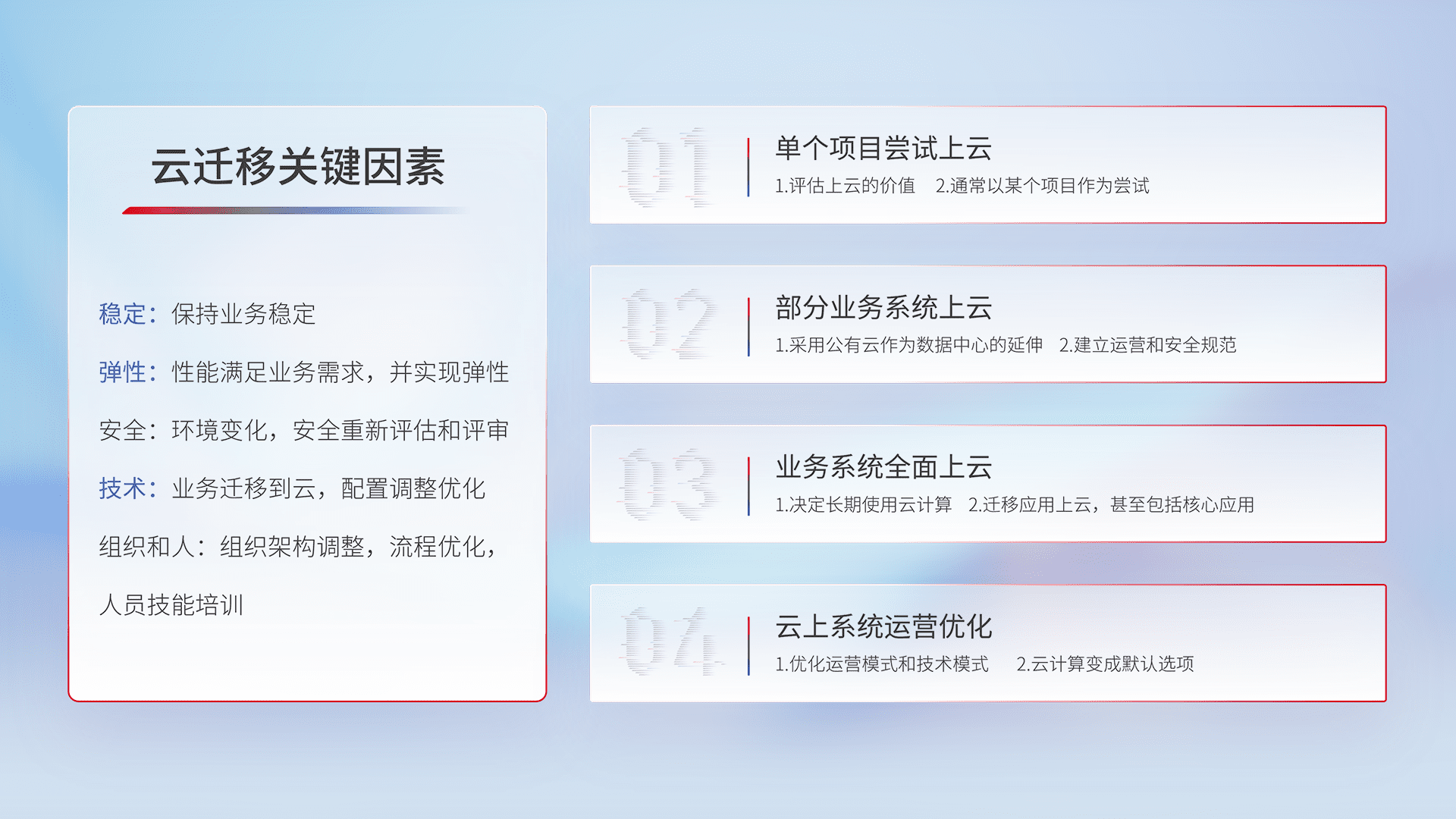 结合实际业务,,,,从规划设计、、云平台选型、、云原生改造、、、、数据迁移、、集成交付,,迁移全过程为客户识别最佳上云路径,,做好风险识别管理,,,,设计网络架构、、身份权限、、、、安全审计合规、、、、操作审计、、、、日志审计、、、、监控告警策略、、、、多站点容灾设计等,,对云上基础设施进行整体规划,,,提升IT治理水平,,,,以满足弹性、、、高可用、、高性能的需求。。。