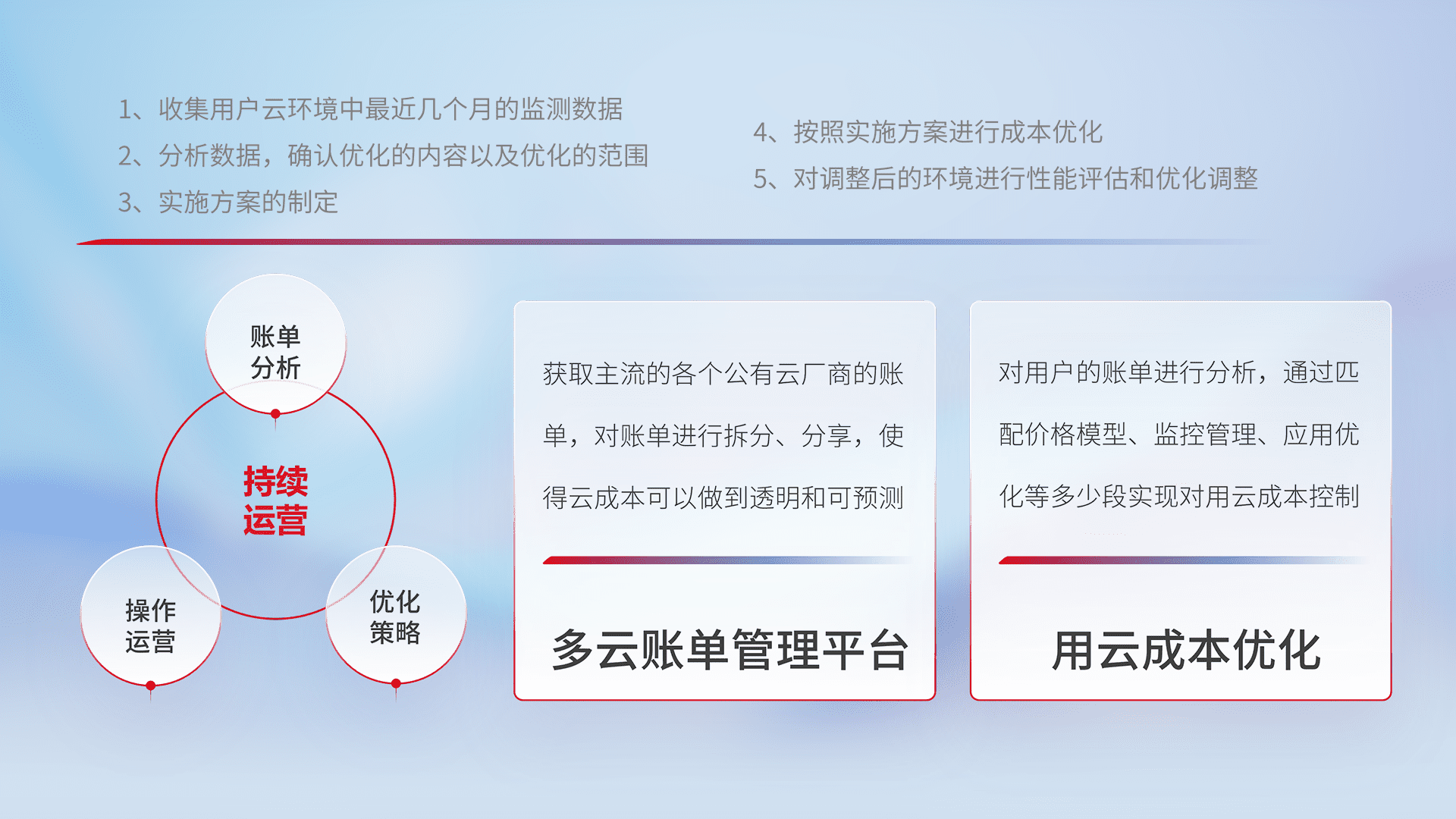 通过多云纳管,,,以统一的资源数据模型把客户的云资源进行抽象和封装,,,,进而实现对多云资源的统一操作,,,,保障云资源管理的可靠性、、、、稳定性与可用性。。。。量身定制化运维内容,,,配置、、、、开发运维、、、、补丁管理、、、、备份、、、、监控、、认证和访问管理、、、审计和日常巡检等,,,,保障在用云过程中的可靠度,,,,稳定度以及高可用率。。